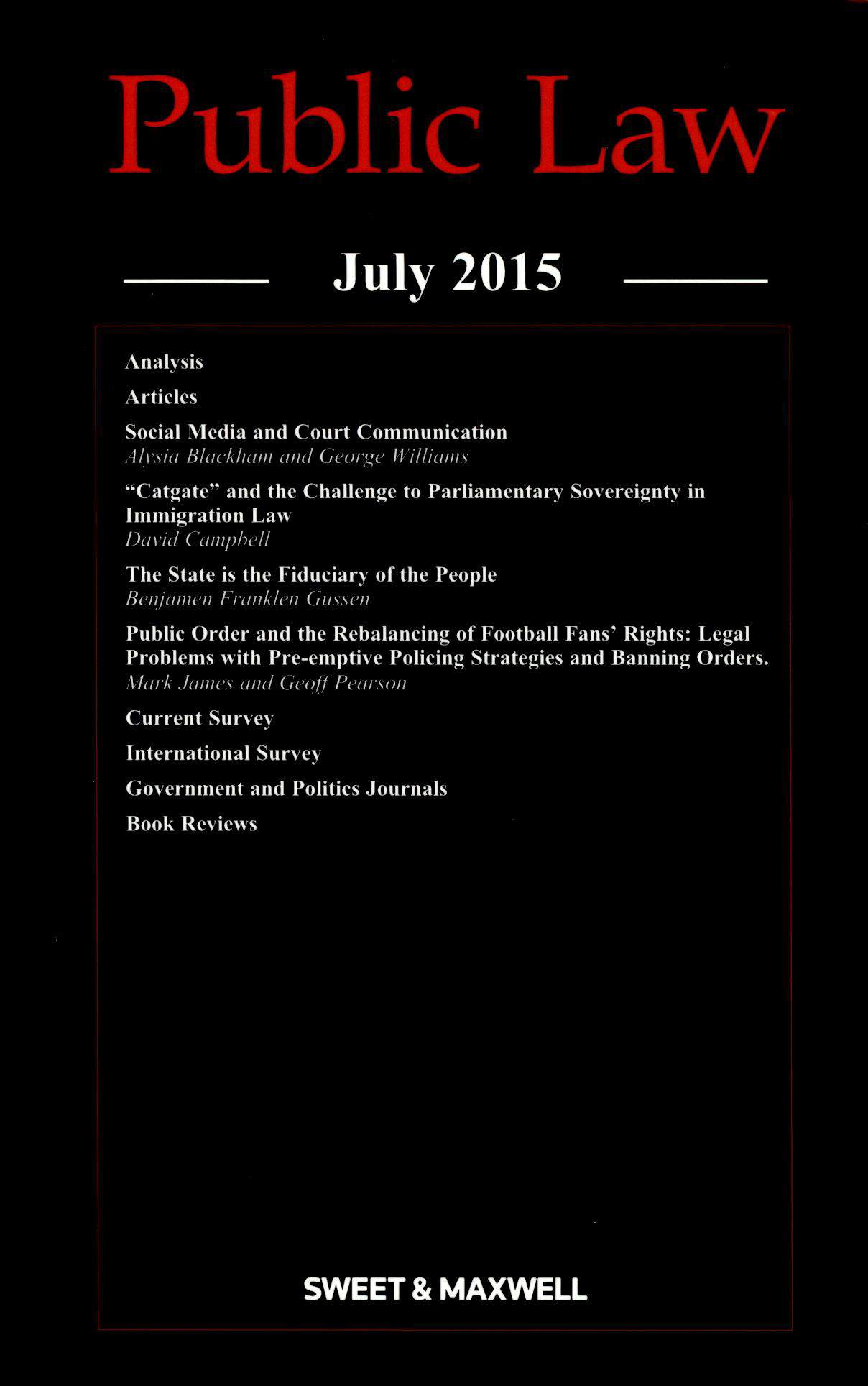 W lipcu ukazało się także najnowsze wydanie „PUBLIC LAW”. W numerze m.in. o nowych tendencjach w orzecznictwie brytyjskiego Sądu Najwyższego zmierzających do zwiększenia roli prawa krajowego i osłabienia wpływów prawa międzynarodowego i europejskiego. Interesujące badania australijskich badaczy prezentują zagadnienie wykorzystanie mediów społecznościowych w działalności sądów – w szczególności w celu pełniejszej interakcji z opinią publiczną. Poza tym m.in. – o orzecznictwie w sprawach wyborów i powierniczym charakterze relacji państwo – jednostka, o wyzwaniu jakie regulacje dotyczące imigrantów stanowią dla zasady suwerenności parlamentu oraz o wyważeniu relacji między prawami kibiców a porządkiem publicznym.