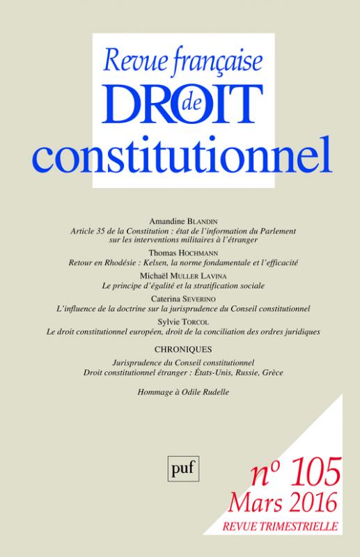 9782130734215_v100W marcu ukazał się kolejny numer francuskiego „REVUE FRANÇAISE DE DROIT CONSTITUTIONNEL” (nr 105), a w nim m.in.: o art. 35 Konstytucji V Republiki Francuskiej, a dokładniej o instytucji informowania parlamentu przez rząd o interwencji zbrojnej podjętej przez armię francuską za granicą; o referendum w Grecji z 5 lipca 2015 r.; o wpływie dorobku nauki prawa konstytucyjnego na orzecznictwo francuskiej Rady Konstytucyjnej; a także o wpływie konstytucyjnej zasady równości na stratyfikację społeczną. Ponadto o europejskim prawie konstytucyjnym jako prawie godzącym odmienne porządki ustrojowe państw członkowskich i o teorii normy podstawowej Hansa Kelsena w „rodezyjskim kontekście”.