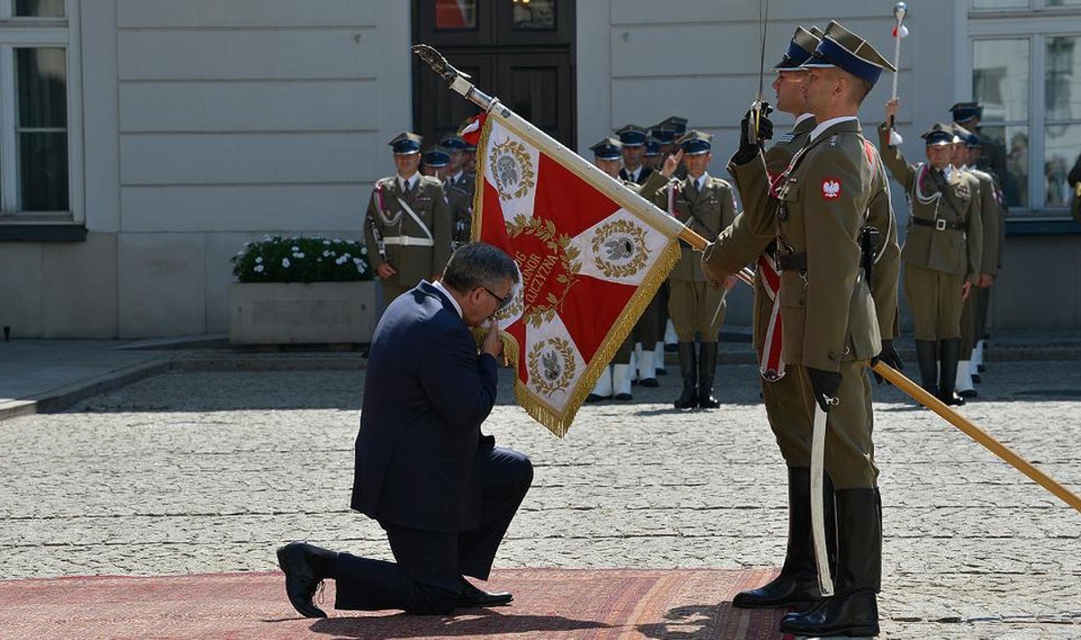 Kończący kadencję Prezydent Bronisław Komorowski żegnając się z wojskiem oddaje honory sztandarowi wojskowemu, dziedziniec Pałacu Prezydenckiego, 2010 r.