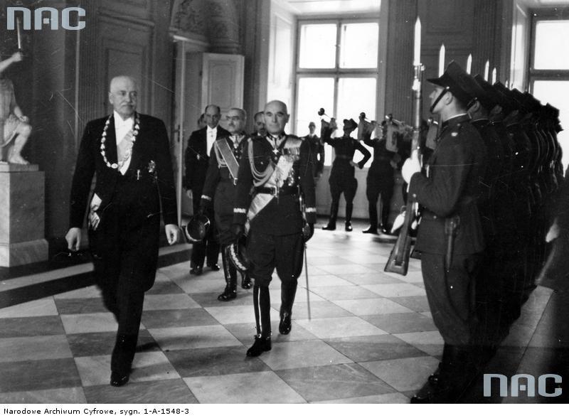 Nowy Prezydent RP, p. Ignacy Mościcki odbiera meldunek. Uroczystość inauguracji prezydentury, 1926 r. Po lewej premier K. Bartel, po prawej Marszałek J. Piłsudski.