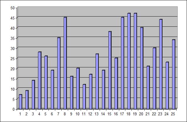 Wykres przedstawia na osi poziomej – kolejne numery pytań, na osi pionowej – liczbę prawidłowych odpowiedzi. Aby otrzymać ocenę pozytywną należało udzielić poprawnej odpowiedzi na co najmniej 13 pytań. Łącznie w sprawdzianie uczestniczyło 50 osób. Najgorszy rezultat (9 i 7 odpowiedzi prawidłowych) osiągnęły pytania nr 1 i 2 (zasady ustroju). Najlepszy (44-47 prawidłowych odpowiedzi) – pytania nr 8, 17-19, 23 (Trybunał Konstytucyjny)